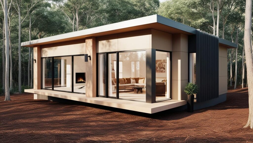Bergen to nowoczesny dom modułowy z kominkiem i panoramicznymi przeszkleniami. Elegancki, ciepły i funkcjonalny – doskonały do całorocznego zamieszkania.
