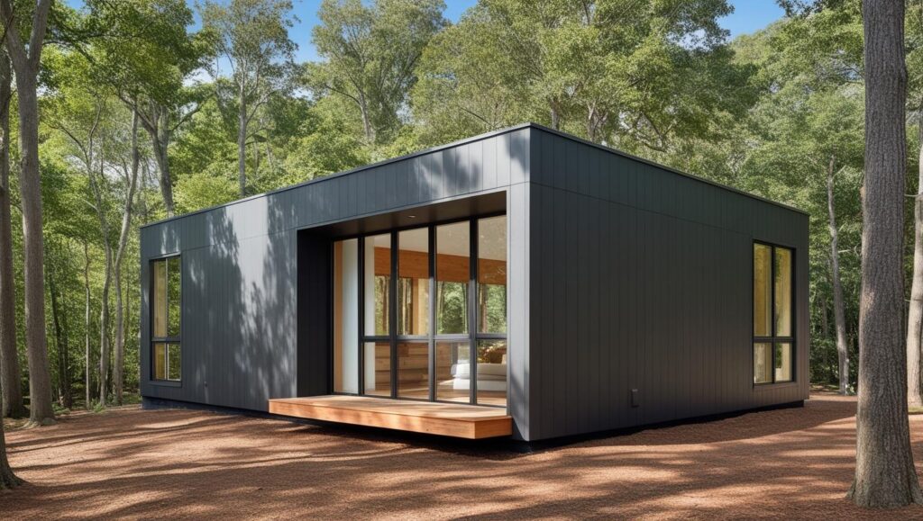 Boston to minimalistyczny dom modułowy o nowoczesnym wyglądzie. Ciemna elewacja i panoramiczne przeszklenia tworzą elegancką przestrzeń pełną światła i harmonii.
