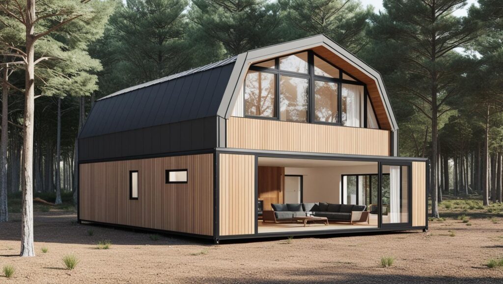 Flamengo to całoroczny domek modułowy inspirowany nowoczesną stodołą. Łamany dach, duże przeszklenia i ciepłe drewniane wykończenie tworzą wyjątkowe miejsce do życia w harmonii z naturą.