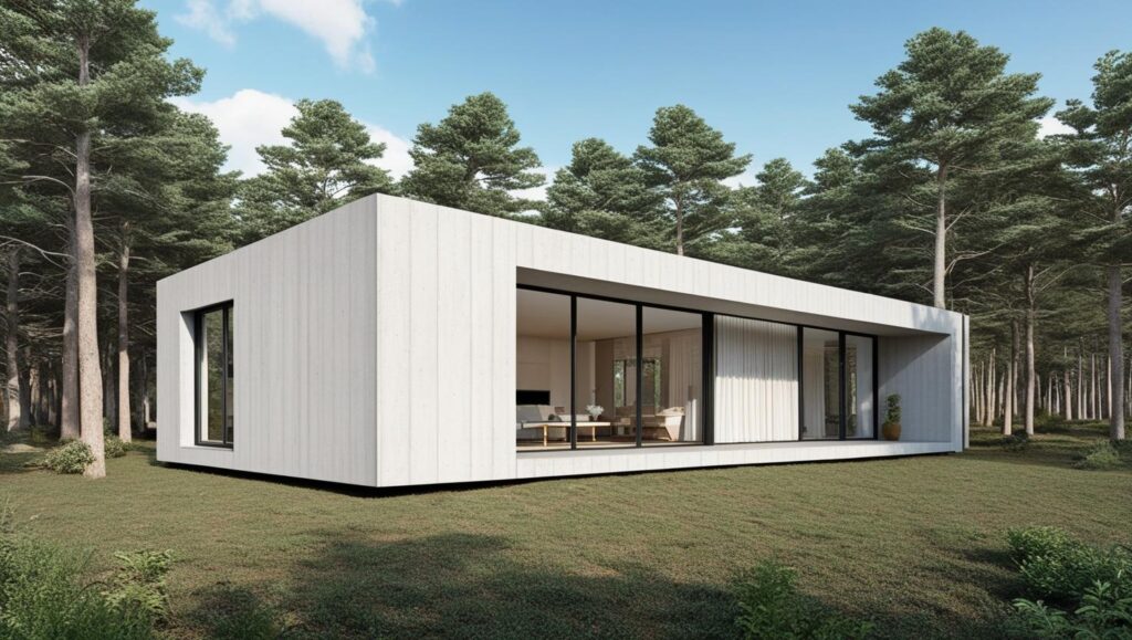 Gloria to nowoczesny, parterowy dom modułowy o jasnej elewacji i dużych przeszkleniach. Minimalistyczna forma i funkcjonalny układ wnętrza gwarantują komfort oraz elegancję w każdym detalu.