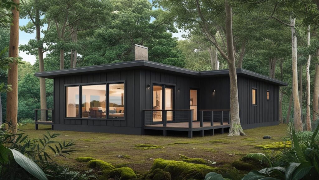 Liberty to nowoczesny dom modułowy o ciemnej elewacji i przemyślanej formie. Przestronny taras, duże okna i elegancki design tworzą harmonię pomiędzy komfortem a naturą.