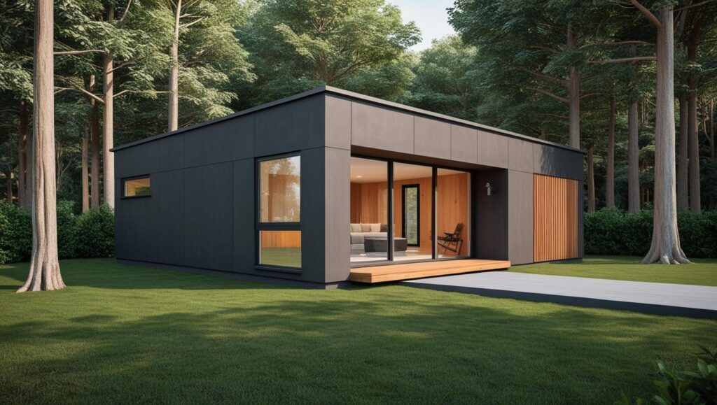 Torino to elegancki, kompaktowy dom modułowy o nowoczesnej formie. Ciemna elewacja, drewniane detale i duże okna tworzą idealną harmonię między designem a naturą.