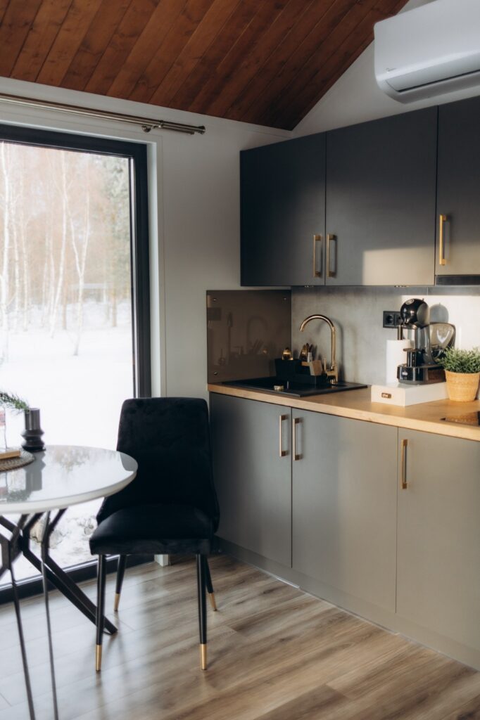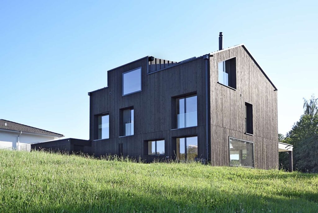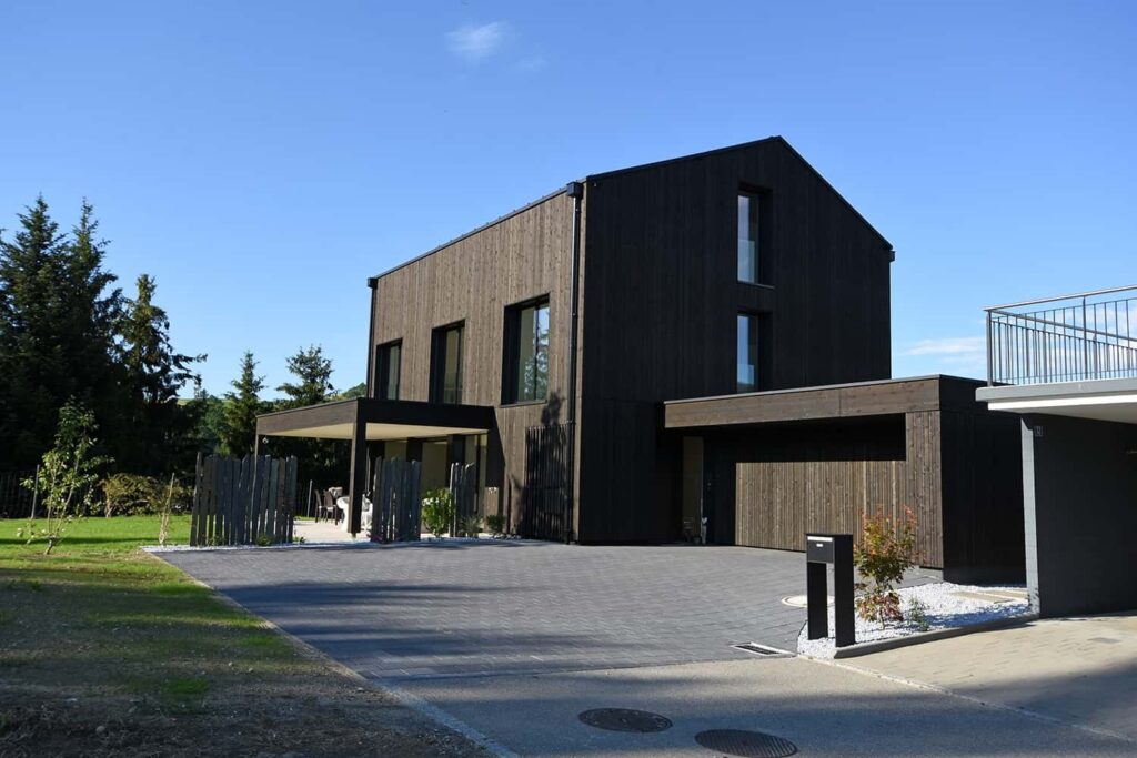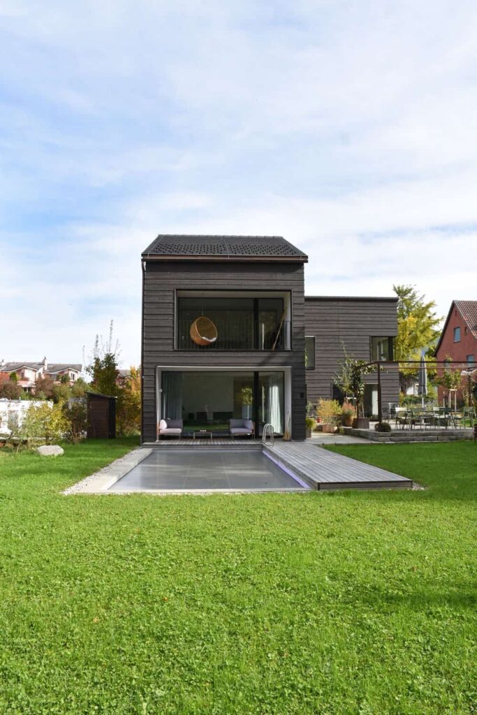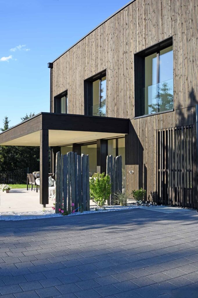 Ciemna elewacja z pionowego drewna nadaje całości elegancki, ponadczasowy charakter i sprawia, że dom subtelnie wpisuje się w teren, zamiast dominować nad przestrzenią. Duże przeszklenia otwierają wnętrza na widok ogrodu i zapewniają naturalne doświetlenie pomieszczeń przez cały dzień.