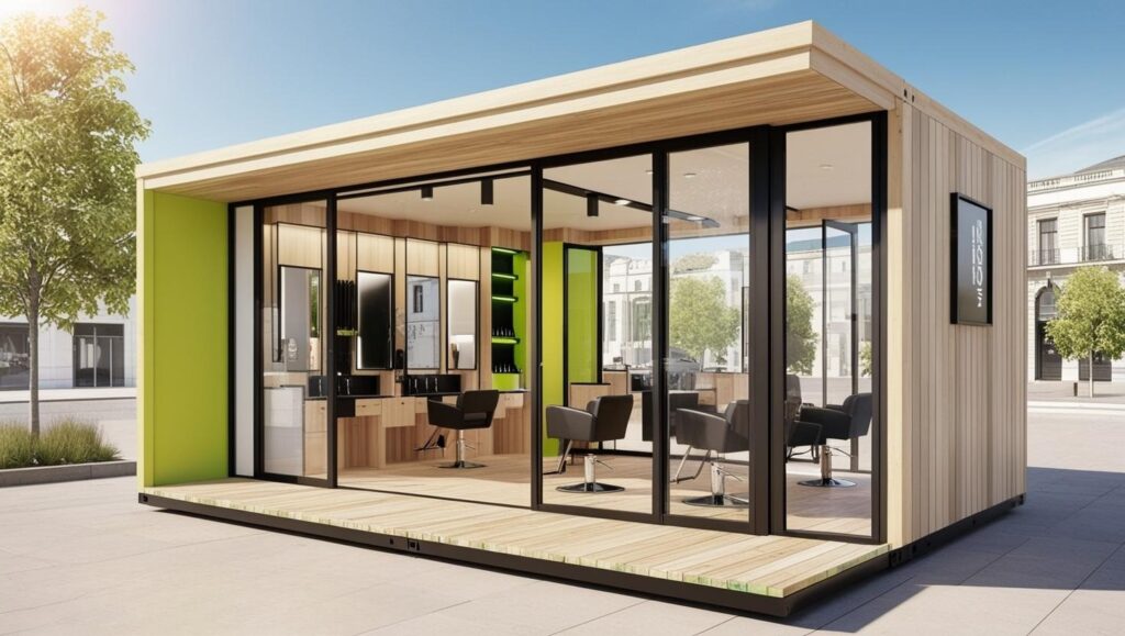 Model 11 to nowoczesny pawilon handlowy modułowy, który łączy elegancję drewna, szkła i koloru w wyjątkowo efektowny sposób. Jasna elewacja z akcentami zieleni przyciąga wzrok i sprawia, że obiekt doskonale wpisuje się zarówno w miejską przestrzeń, jak i w otoczenie parkowe czy rekreacyjne. Duże przeszklenia zapewniają maksymalne doświetlenie wnętrza, co czyni go idealnym miejscem do prowadzenia salonu fryzjerskiego, gabinetu kosmetycznego, showroomu lub nowoczesnego biura. To połączenie funkcjonalności, estetyki i nowoczesnych technologii modułowych – gotowe rozwiązanie dla firm, które chcą działać szybko i efektownie.