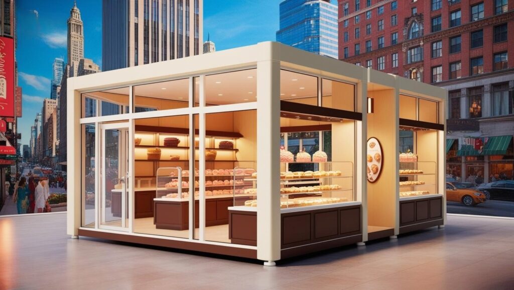 Model 6 to kompaktowy, stylowy i funkcjonalny pawilon handlowy modułowy z płyty warstwowej, zaprojektowany z myślą o lokalach usługowych, gastronomicznych i cukierniczych. Dzięki nowoczesnej formie i dużym przeszkleniom, wnętrze jest doskonale widoczne z zewnątrz, co przyciąga uwagę przechodniów i zachęca do odwiedzin. Ciepła kolorystyka oraz eleganckie wykończenie sprawiają, że pawilon prezentuje się profesjonalnie i estetycznie w każdym otoczeniu – od centrów miast po galerie handlowe i deptaki. To idealne rozwiązanie dla osób, które chcą prowadzić własny biznes szybko, komfortowo i bez zbędnych formalności.